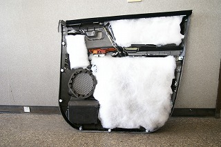 ドア内張り内の付帯音をもう一歩進んで解消するために、内張りとインナー側の鉄板の空気層に綿を入れてみることにしました。